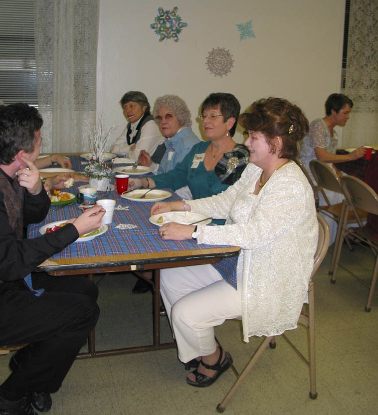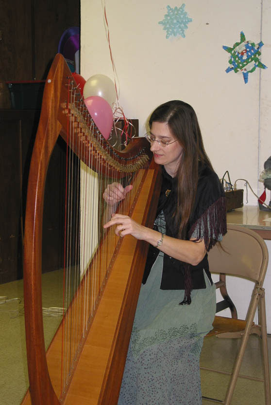 Dressed in their finery, dancers savored a turkey and ham dinner, and delicious potluck dishes. Geri Stuart pleaded for everyone to make the same dishes next year, because "this year was the best dinner ever!" Jennifer Pratt-Walter entertained the diners with her melodious Celtic harp.
