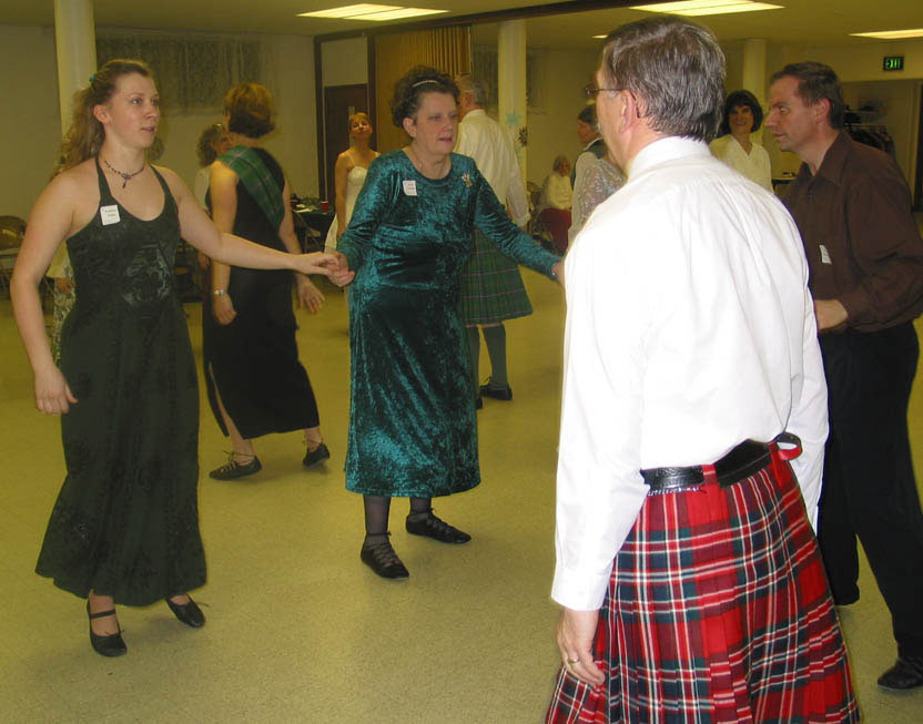 Adapted for Scottish Country Dancers, excerpted from Jonathan Sivier's (et al) list for Contra Dancers. With thanks (and apology) by Marge McLeod van Nus. Because beginning dancers look to experienced dancers as knowing how, remember to: 1. give them confidence by showing you like dancing with them. 2. make eye contact - this is Social Dancing! 3. be careful not to push, pull, or shout. 4. "lead" a new dancer with eye contact, hand gestures (ie. tap your own correct shoulder to be passed in reels), and subtle motions (such as a nod of the head). 5. know for sure which hand to give or which way to move in a reel. 6. not get upset when mistakes are made, we all make mistakes at times. 7. refrain from forcing an issue, show politeness by example, let the teacher sort out mistakes. 8. dance smoothly and to the best of your ability, show them how it is done. 9. encourage and acknowledge their effort, accept and affirm their dancing. 10. stay with the instruction/walk through and do not go ahead because you know the dance, they do not and are just now learning; set a good example for new dancers to follow. | ||||||||||||||||||||||||||||||