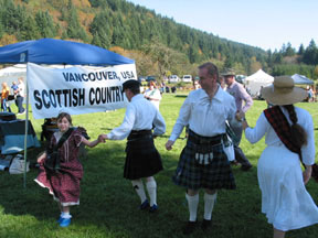 It could not have been a more beautiful fall day, out at the farm. People came in droves to attend Pomeroy Farm's annual Pumpkin Festival, visiting the booths, stuffing scarecrows, and taking hayrides to the pumpkin patch. The best part of all, of course, was the Scottish Country Dancing. This time all the booths were set facing inward toward the lawn where we dance, giving us good exposure. We set up camp under our tent, displaying the beautiful banner that Don and Marie Morrison donated to our group. An interesting challenge soon presented itself--a malfunctioning CD player. So, while a set of us danced to our own singing and humming, Martin MacKenzie, techno-hero, figured out how to get the music working using the cassette-to-CD gizmo from his car. We were saved! Demo dances were interspersed with enthusiastic audience participation. A really good crowd. Lots of kids, who loved the "I Danced with the Vancouver USA Scottish Country Dancers" stickers we handed out. (Thanks, Geri!) Another fun addition to the day was the new lunch choice of barbecued pork cutlet with cheesebread. Yumm! Then more dancing to work it all off. The sparkle in the air was reflected in the joy of the dancers and the willing participation of the audience. Dancing, sharing, eating -- how much better could life get? | ||||||||||||||||||||||||||||||