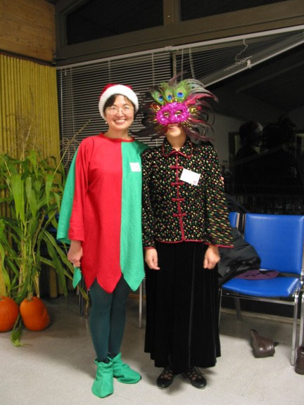 The garb represented a "criss-crossing" of various themes and cultures. While one dancer worked with the Harvest time theme, dressing country style in fall tones accented with complementary plummage of some hapless game fowl, others went with the more traditional Halloween costume theme and included a doctor (or two!), a jester, a ghost, a witch, and a kilted Federation Starship officer. Valerie (one of the doctors) admitted this was the first time at a SCD event (class or dance) that she did not wear a skirt!