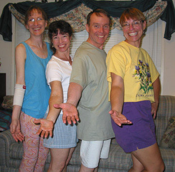 Yet another theme was evident in the many "ladies" wearing some type of dark red garment. By way of explanation: one of the more popular (and challenging) dances on the program that night was The Cranberry Tart. Working with the "cranberry" half of the theme, Marge van Nus wore a dark wine-red shawl and a straw hat adorned with cranberries, and Susan Shaw wore a cranberry colored skirt. Providing a kind of balance, Geri Stuart wore a cranberry skirt and top, a fur stole, long beaded necklace, black choker, fishnet stockings, and spike heels, and Tom Halpenny (our Manager) wore a red dress -- the, ah, other half of the Cranberry Tart theme. And quite a number of folks came as themselves, simply eager to join in an evening of fun, dancing, and great music, topping it all off with a relaxing "tea" of wonderful snacks with good friends. | ||||||||||||||||||||||||||||||