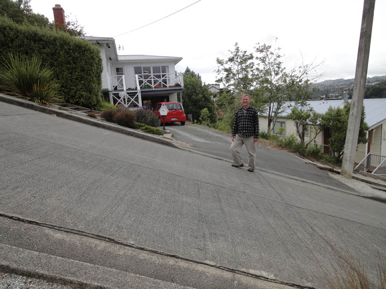 The city's surveyor, Charles Kettle, planned the city to create beautiful views over the town center and its dramatic harbor setting. The basis of the plan is The Octagon (a flat central city) and the Town Belt (a strip of natural bush and parks that separates the city center from its hilly suburbs). The plan often disregarded the very hilly terrain, and its most famous result is Baldwin Street, recognized by the Guinness Book of Records as the steepest street in the world. Liza and I found and summited Baldwin Street - yikes!