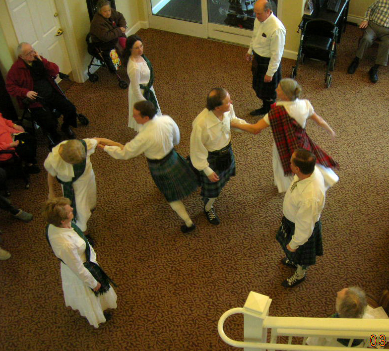 Since the 1980's we Scottish Country Dancers have frequently been asked to "become Irish" even though we "Dance Scottish." March 2013 was no exception. Within two weeks we completed 3 demos celebrating St. Patrick. Many thanks to all who danced; some one time (Sally B., Rebecca, Kate, Kathleen), some two times (Norma, Jim, Martin), and those three time troupers (Liza, Susan, John, Tom, Geri, yours truly). As a result of your dedication we have donated substantially to the Branch treasury.