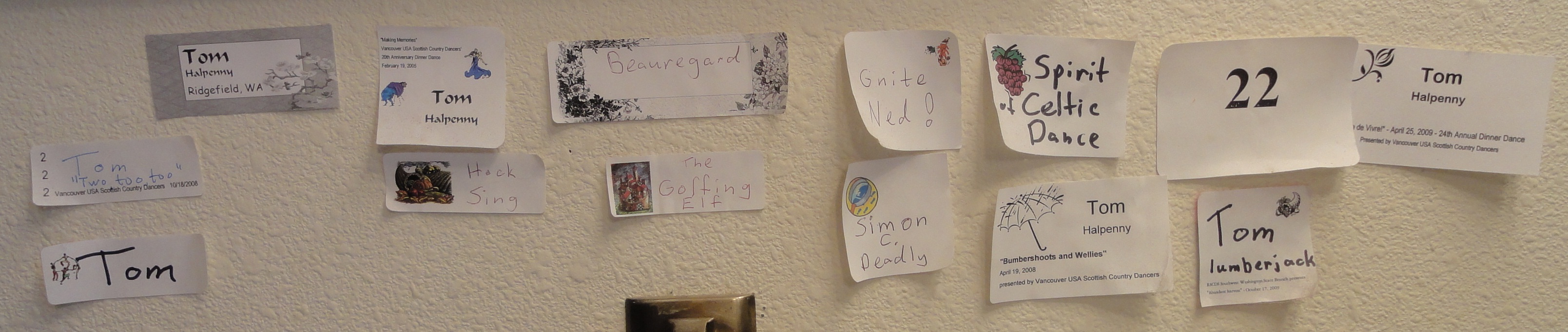Van Meter Hord has printed stick-on nametags for previous dance events, decorated with fun graphical dance themes. We are trying an experiment for the May 4, 2013 Dinner Dance. We will present the SCD Branch laminated nametag to all participants who do not already have a nametag.