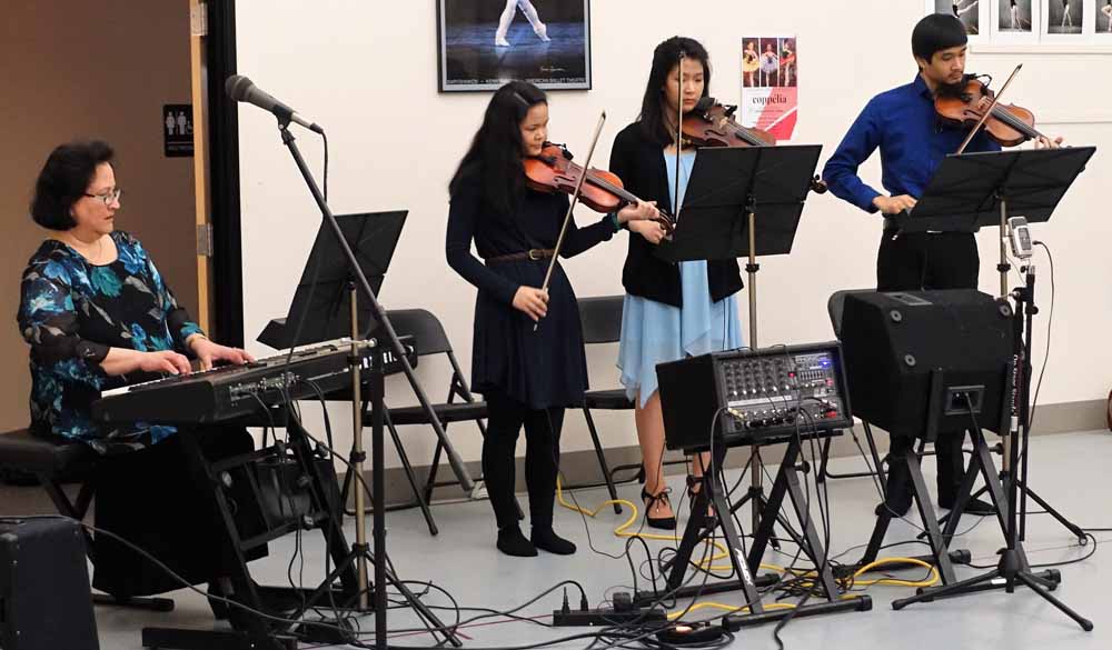 Second dance: I would like to introduce our excellent musicians! The Soohoo-Hui family. Band leader Cynthia, Lilyana, Elisabeth, Nathaniel. The Soohoo-Hui family!