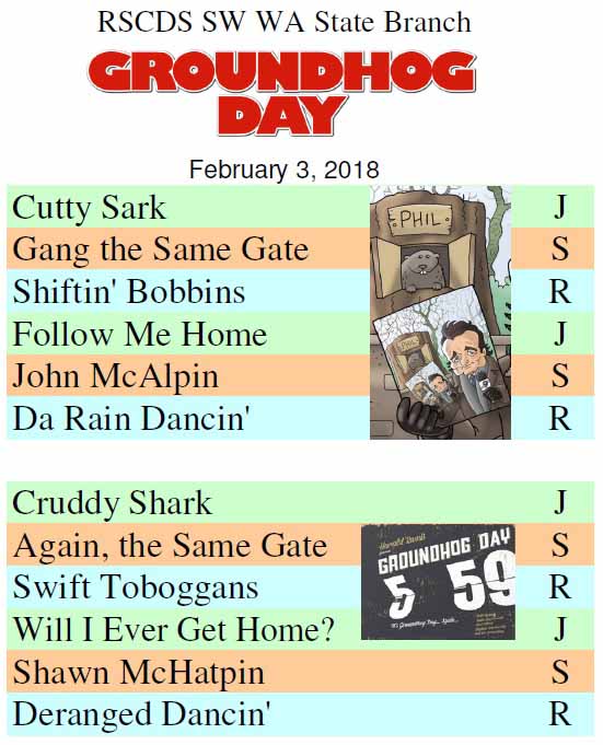 The typical Scottish dance program has twelve dances. The Groundhog Day dance has six dances in the first half, and we repeat the same six dances in the second half. These are six of the best Scottish dances which would be really fun to dance a second time. I had imagined the idea about three years ago, after some of us Scottish dance friends had viewed the Groundhog Day movie a few times, in which TV weatherman Phil Connors relives Groundhog Day over and over and over. Each repetition plays out slightly differently, as Connors learns from earlier cycles. The similarities and subtle differences of each repetition make for a humorous blend of wit, charm, and personal growth. Comparing the roles in the Groundhog Day dance with the movie, the dancers play the Phil Connors role, while the emcee, briefers, and musicians play the rest of the world.