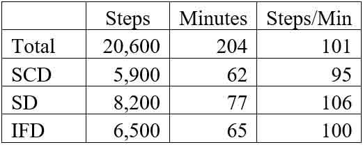 6,000 pedometer steps in 60 minutes, knowing that continuous walking equals 125 steps/minute and one mile equals 2,160 steps. The Scottish dancing format measured 95 steps/minute with playing music four times each dance without any recaps. I selected most dances that I already knew with a few memory lapses. I danced three-couple dances in a four-couple set as 1st couple, 1st couple,
